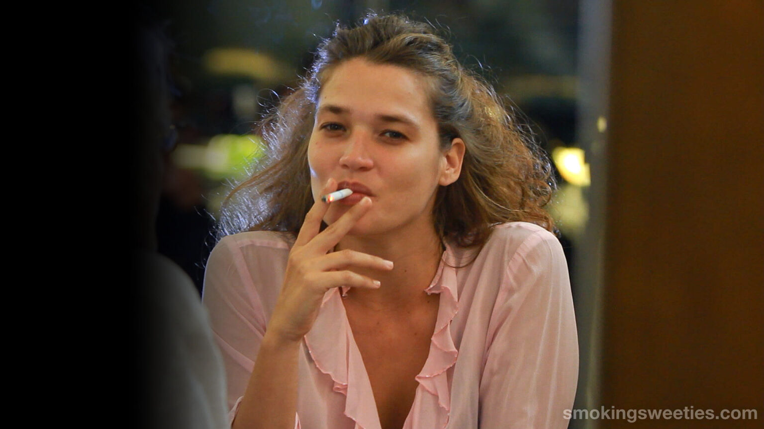 • Scene 1: Sabrina, wearing a sheer white chemise, begins the first scene in the kitchen at night, passionately smoking three red 100s cork cigarettes, two of which are chain-smoked. Her exhales are intense and deliberate, almost like a breathing exercise for a yoga teacher. She smiles at the camera with satisfaction and sadness while exhaling smoke through her nostrils. The peace of the moment is only interrupted by her wet smoker’s cough. The sound of the cigarette crackling anticipates her deep inhales with evident pleasure. The sound of her labored breathing and her smoker’s voice completes the picture of her before-bed routine.She speaks in Italian, with English subtitles, explaining how inhaling the smoke deeply into her belly gives her unparalleled pleasure. Her chest visibly inflates with each drag. In a melancholic tone, she confesses that smoking is one of the few moments of happiness in her daily life. At the end of the scene, she wears an open denim jacket that reveals her slim and athletic figure.